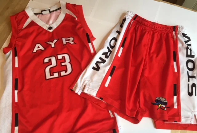 The Red Ayr Storm Basketball Strip is our home Strip and our most worn strip as we often wear the Red strip to away matches as well. (Top only is £25, shorts only are £20 - comment in box for name if not a full kit being ordered)